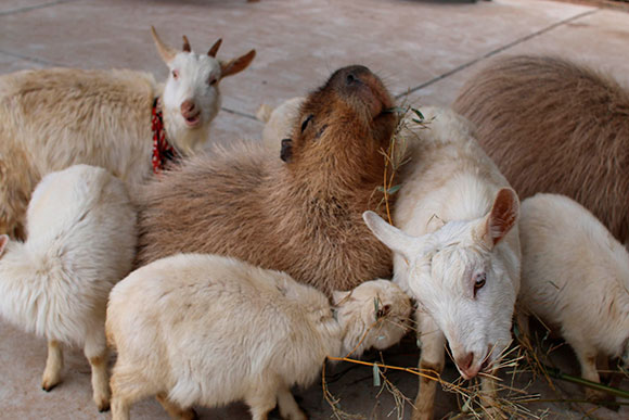 ヤギに囲まれ、マッサージをされているわけでもないのに悦な表情が自然発生することも。