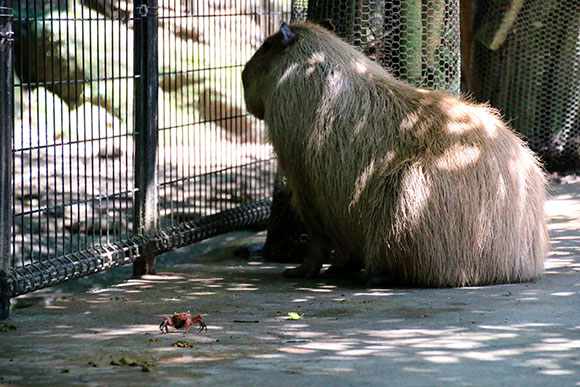 クジャクと同様、カニもカピバラのところに遊びにやってきます。